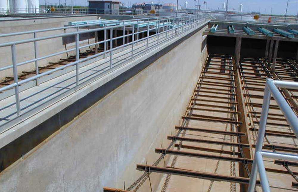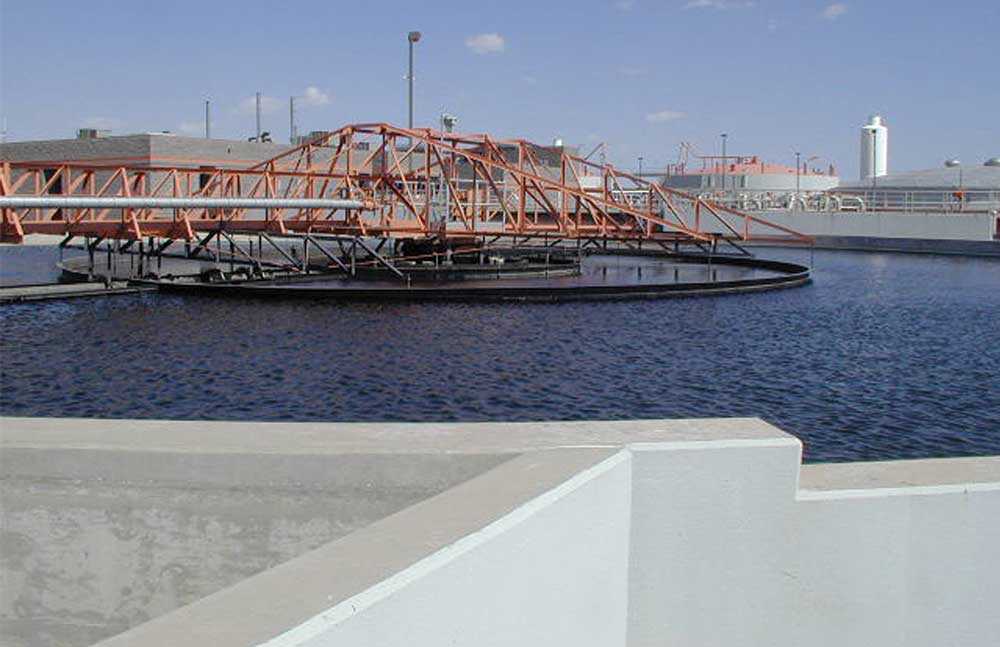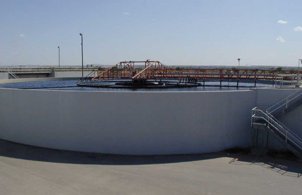 The Bustamante WWTP includes 110-ft diameter by 30-ft high digesters, 120-ft diameter by 20-ft high primary clarifiers, and 140-ft diameter by 16-ft high secondary clarifiers. They were all constructed with no joints using shrinkage-compensating concrete. More than ten years later they are still crack free and leak free. Figure 1 is a typical secondary clarifier. The straight walls were constructed with 100-ft joint spacing and while there are a few eight cracks, they are virtually maintenance free. Jose L. Ramirez, the Plane Superintendent, stated “There are a few little cracks, but very few compared to other plants.”