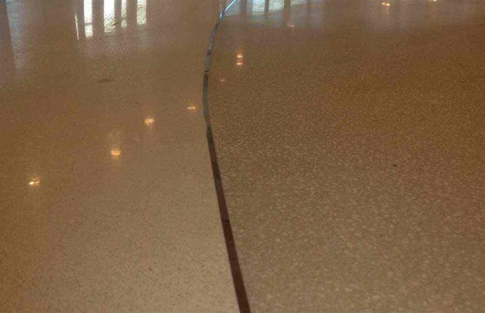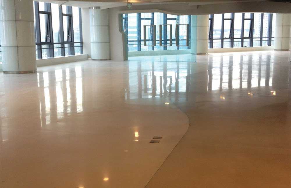 To improve adhesion between the substrate and the TRU floor topping, TXP TRU, a moisture and alkali insensitive interior/exterior epoxy primer, was applied. Batches of TRU Self Leveling were mixed with varying concentrations of gray pigment to achieve different hues in the finished floor. The surface was ground, polished, and sealed.