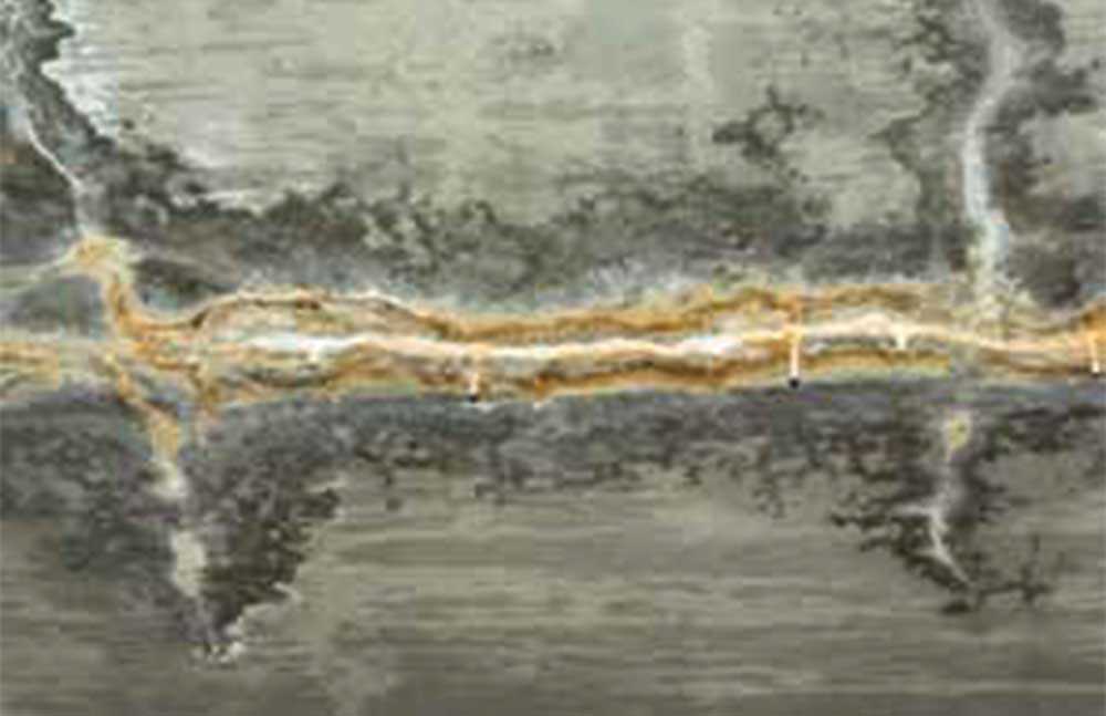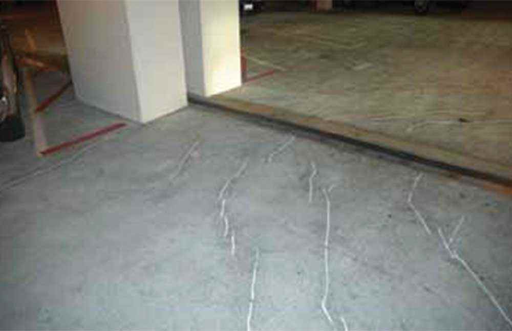 The buildings were built in two phases: first an initial level (L1), and then two upper levels (L2 and L3) as the need for additional parking arose. The first elevated level (L1), built with normal-weight portland cement concrete, was completed in the early 1990s and immediately began to crack severely. Eventually, over 70,000 linear feet of cracks were measured and repaired in the 480,000 square feet of floor area in both structures. Prior to repair, some of the cracks allowed the passage of water through the slab, resulting in unsightly efflorescence at the slab soffit and potential damage to cars below (Figure 1).